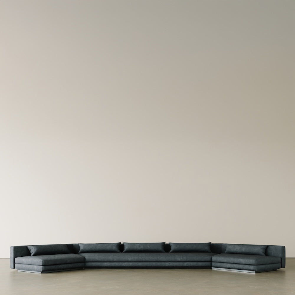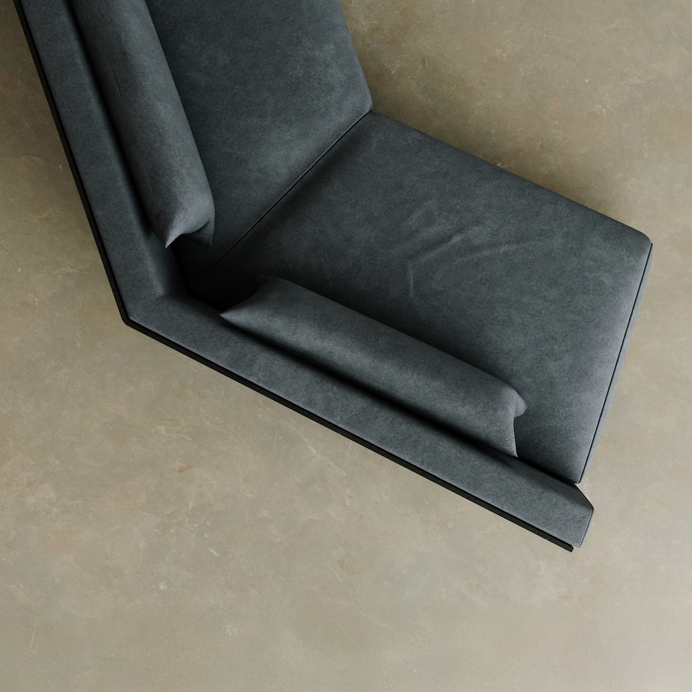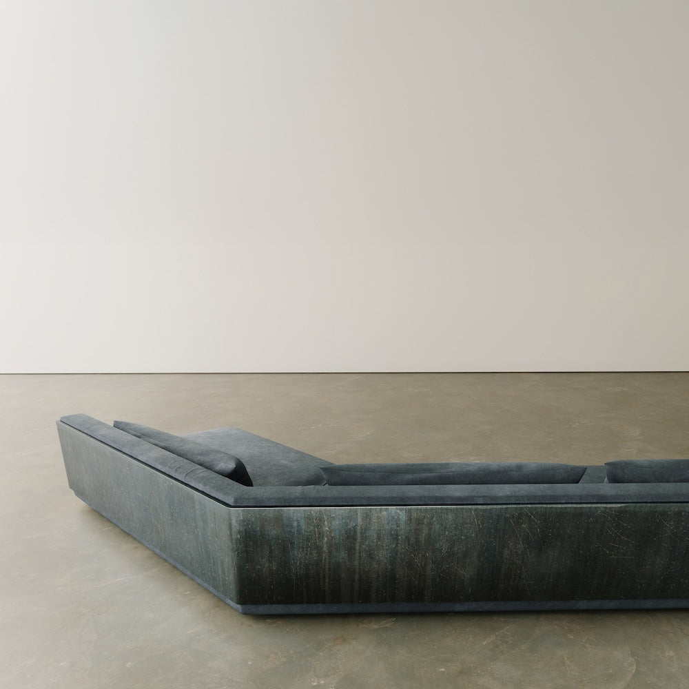 The Kirk Sofa Bleu redefines modern luxury with its striking combination of blued steel, brushed stainless steel, and fabric upholstery. Its sleek angular form, combined with deep hues and refined textures, creates a bold and sophisticated statement.